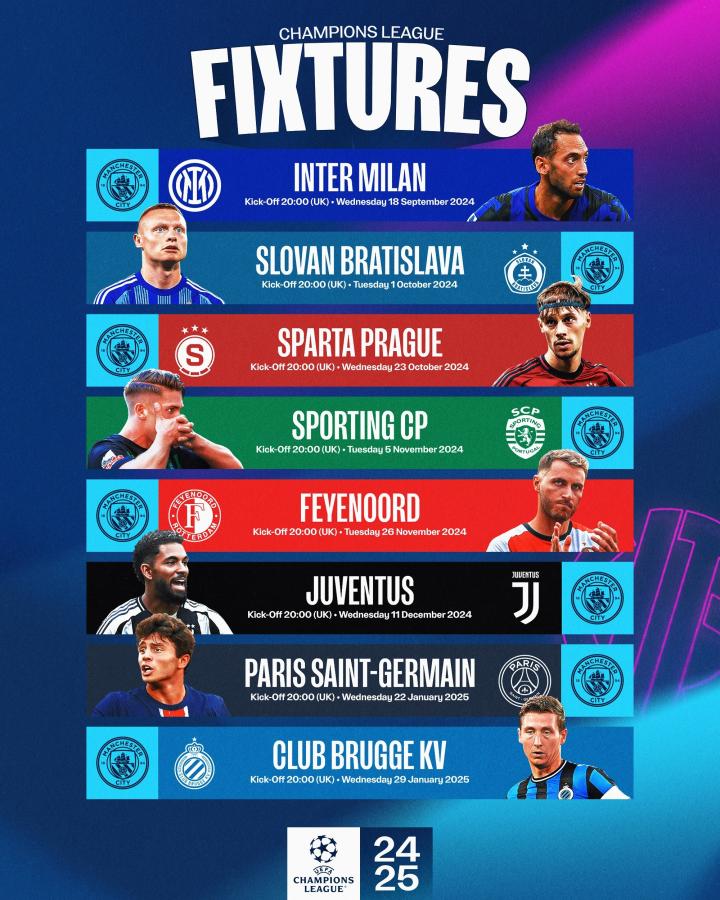 曼城欧冠赛程:首轮迎战国米,第7轮客战巴黎