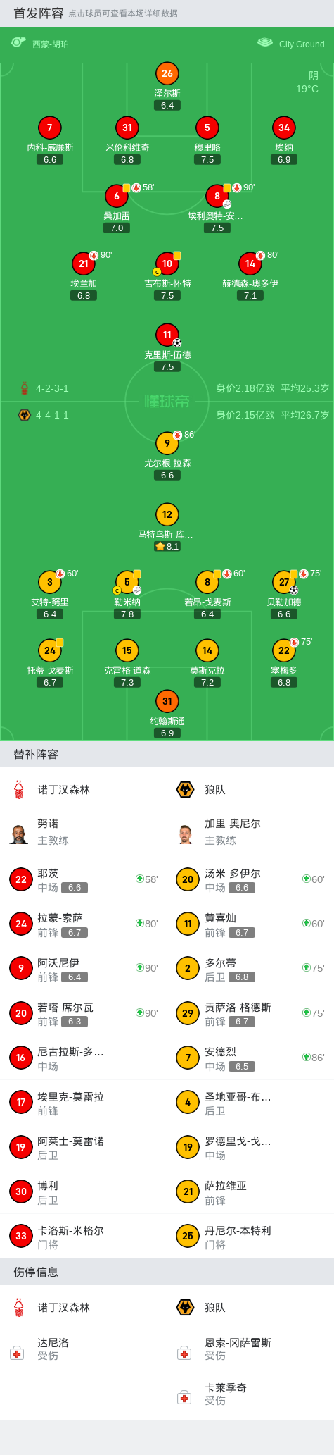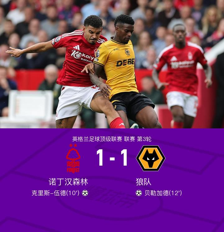 在英格兰足球顶级联赛第3轮的比赛中,诺丁汉森林坐镇主场迎战狼队。上半场,克里斯-伍德头球破门,贝勒加德远射世界波迅速扳平比分。下半场,安德森抽射打高,克里斯-伍德绝杀球被吹越位,最终,诺丁汉森林1-1战平狼队。