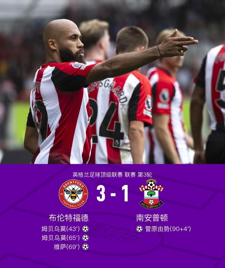 布伦特福德3-1南安普顿,姆贝乌莫双响,菅原由势破门