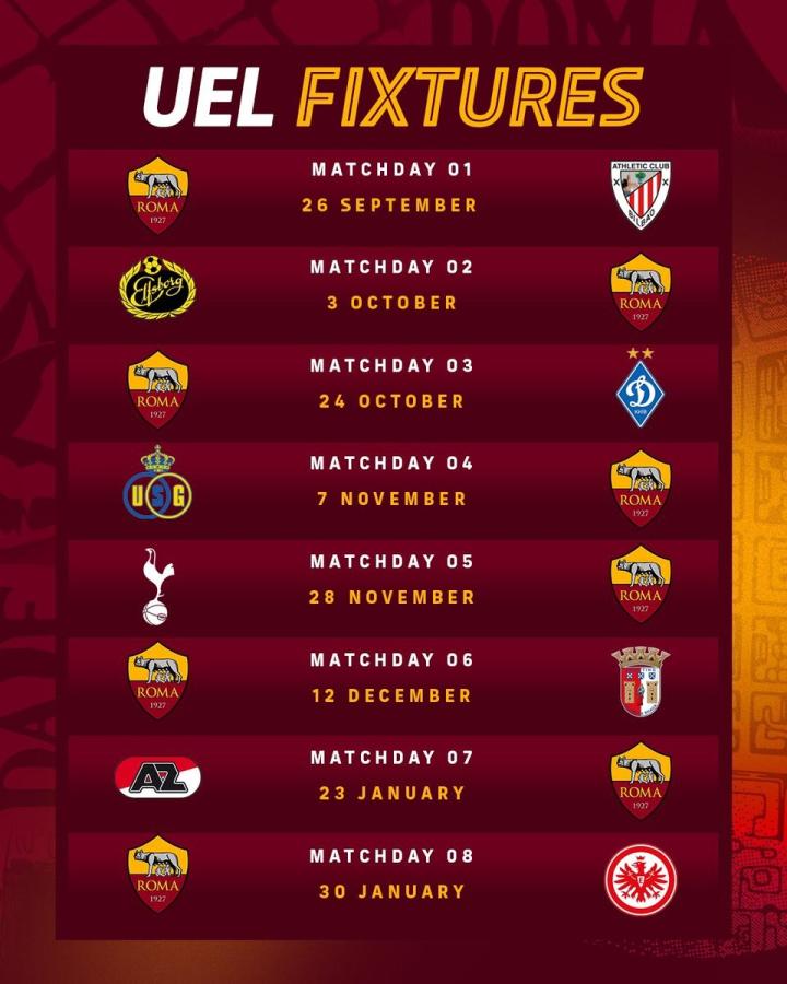 罗马公布了他们新赛季欧联杯联赛阶段的具体赛程,欧洲当地时间9月26日他们将会首先在主场迎战毕尔巴鄂竞技,他们客场与托特纳姆热刺的比赛则会在11月28日进行。