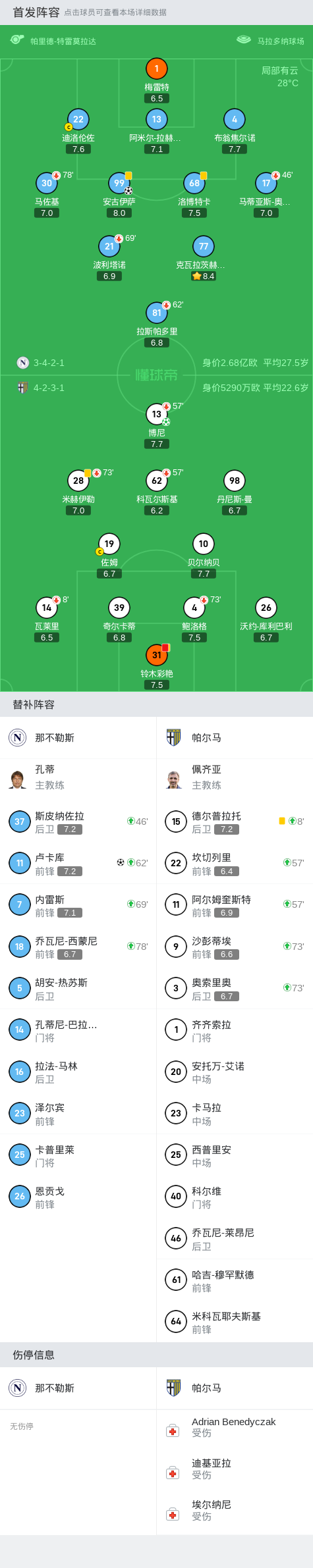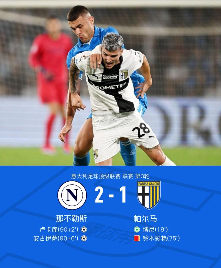 在意大利足球顶级联赛第3轮的比赛中,那不勒斯主场迎战帕尔马。上半场,博尼禁区内倒地造点,亲自操刀主罚命中先拔头筹。下半场,克瓦拉茨赫利亚多次尝试内切射门,可惜角度太正均被铃木彩艳化解。铃木彩艳出击踢倒内雷斯吃到第二张黄牌被罚下,德尔普拉斯担任门将。乔瓦尼-西蒙斯禁区内倒地判罚点球,VAR回看后取消点球判罚。斯皮纳佐拉助攻,卢卡库破门将比分扳平。内雷斯传中,安古伊萨头球破门将比分反超。最终那不勒斯主场2-1逆转十人帕尔马。
