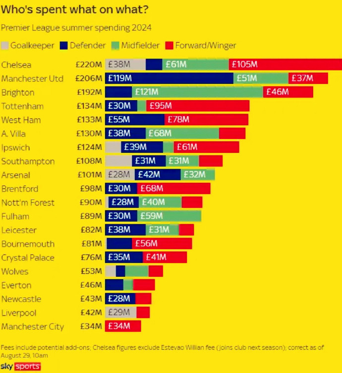 (图)刚刚过去的这个夏窗,布莱顿的引援花费仅次于切尔西,净投入冠绝欧陆。