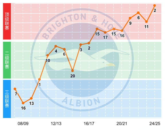 (图)自布鲁姆接手以来,布莱顿的联赛排名持续攀升。