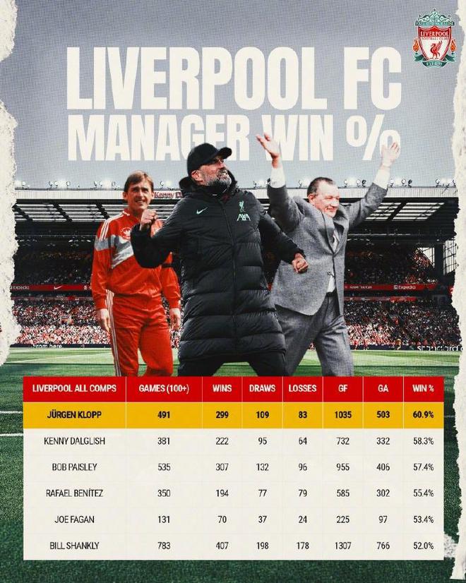 (图)克洛普任内,利物浦的净支出为3.46亿英镑,为BIG6中最低,斩获第二多的主要奖杯(7座)。