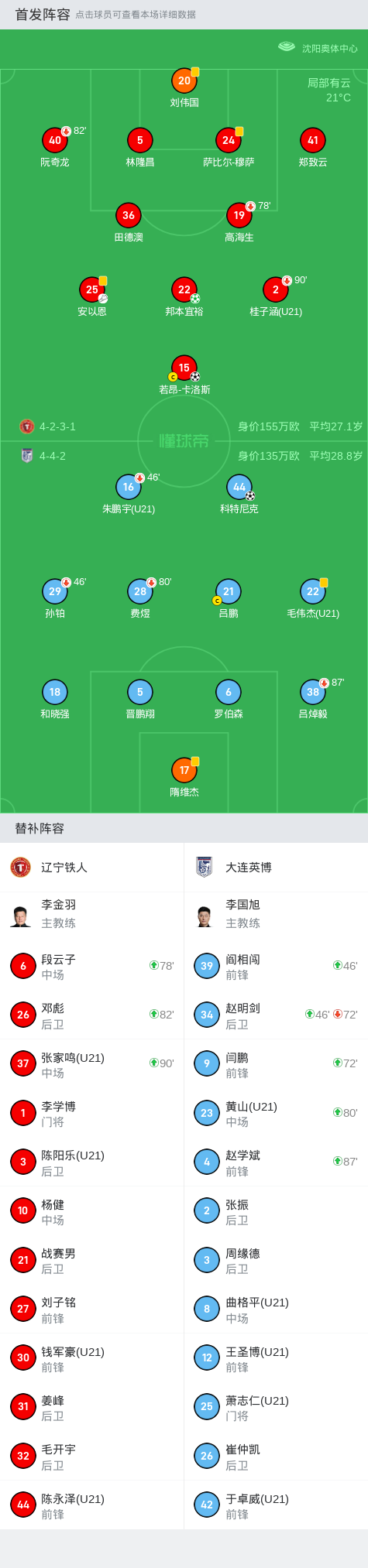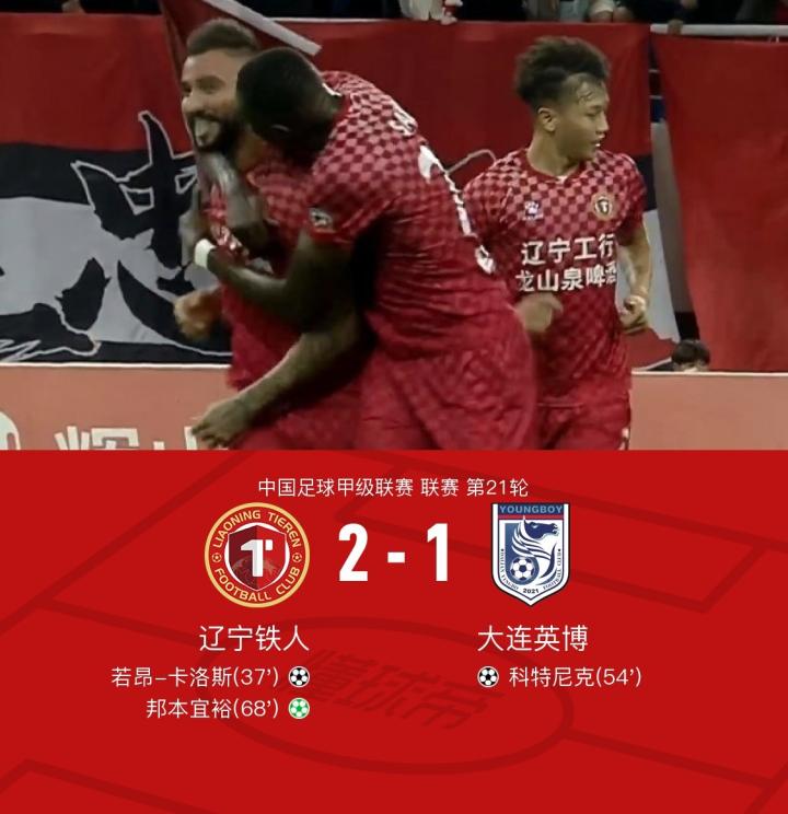 在中国足球甲级联赛第21轮的比赛中,辽宁铁人坐镇主场迎战大连英博。比赛中,辽宁铁人队的若昂-卡洛斯在安以恩的助攻下率先破门,为主队取得领先。随后,大连英博队的科特尼克在阎相闯的助攻下扳平比分。比赛进行到后半段,辽宁铁人队的邦本宜裕通过点球再度将比分超出。最终,辽宁铁人以2-1战胜大连英博。