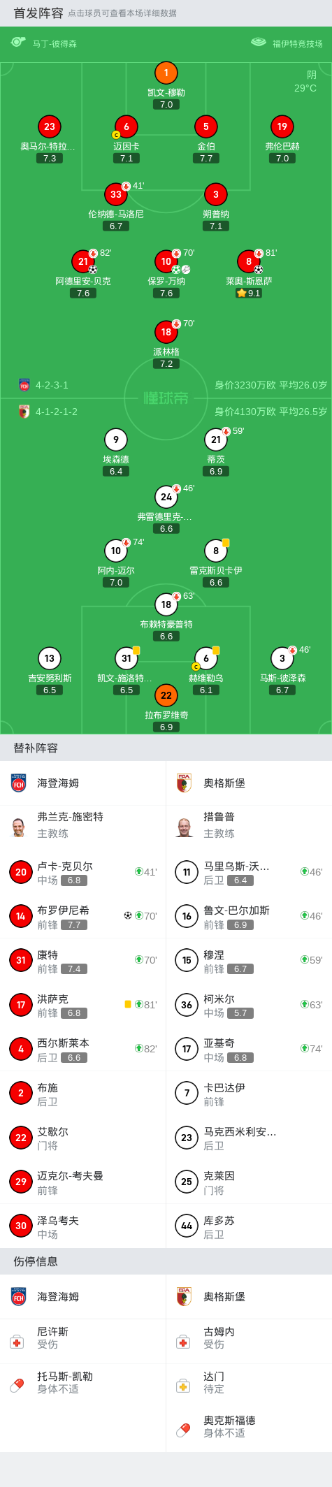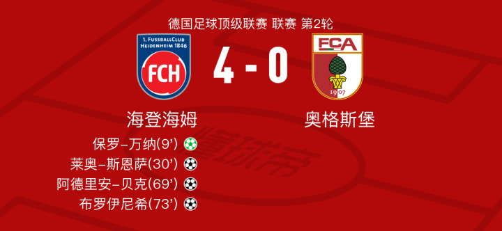海登海姆4-0大胜奥格斯堡取各项赛事5连胜,布罗伊尼希建功,阿德里安-贝克破门