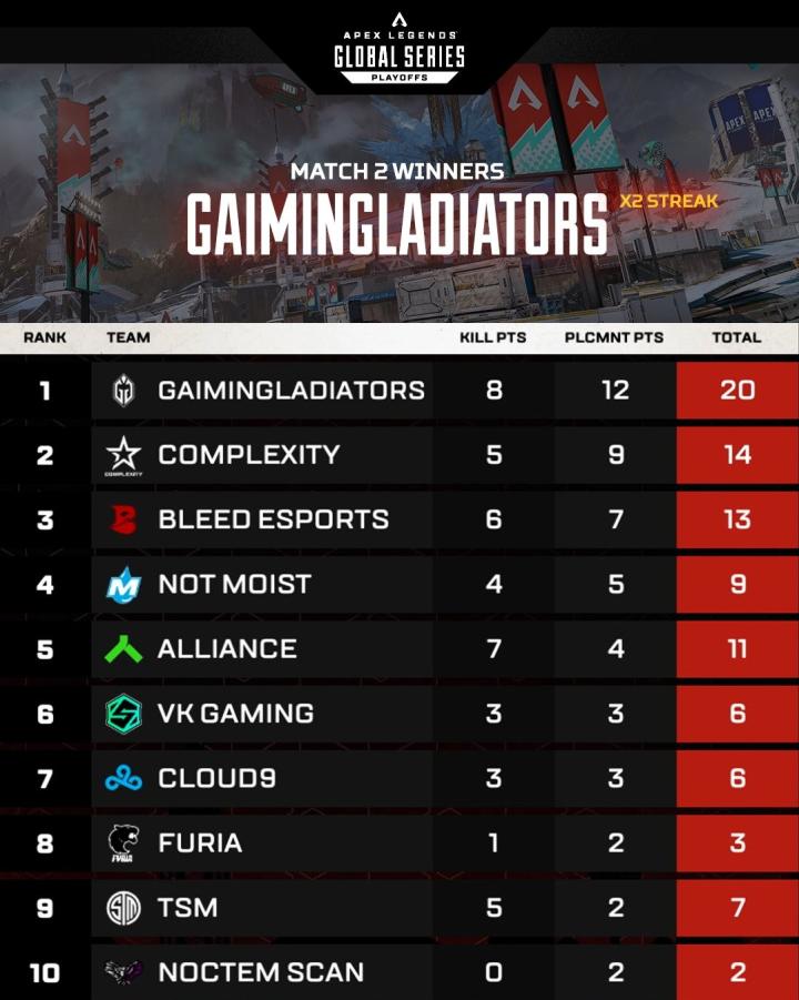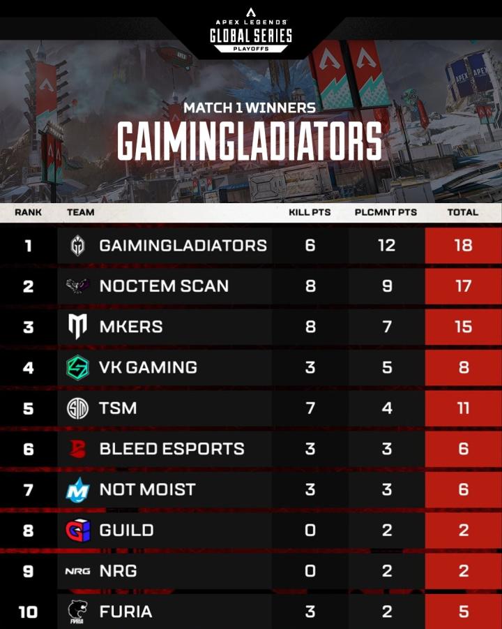 GaiminGladiators迅速进入状态,开局连吃两鸡,拿到38分。