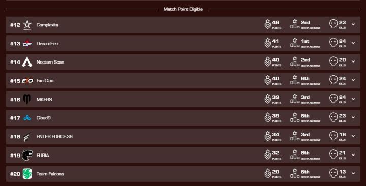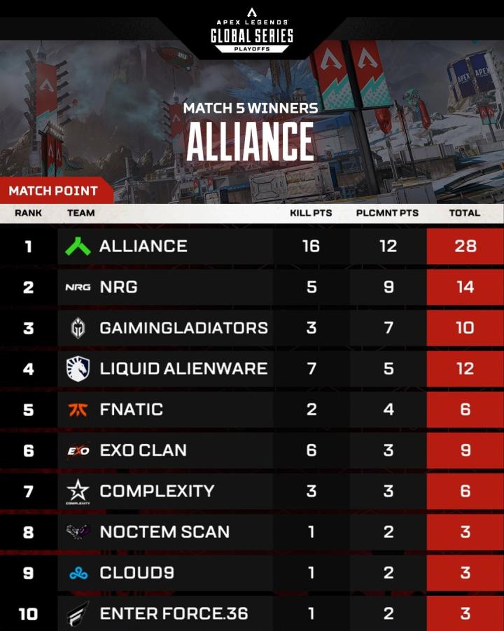 FNC在开局打掉DF后占据了有利位置最终吃鸡,拿到17分。A队位列第4拿到13分,总分来到57分同样打开赛点。