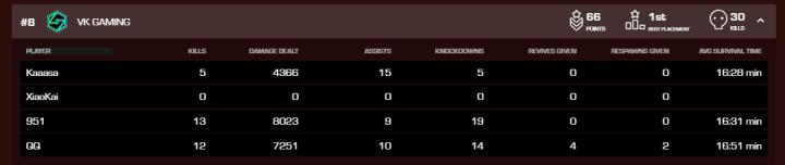 你方唱罢我登场,VKG在第4局成功吃鸡,CN战队在决赛阶段达成2连鸡。VKG在决赛圈卡死了GUILD和TSM,单局拿下20分。