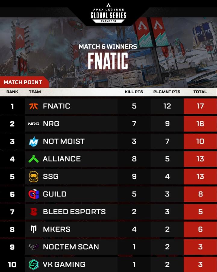 第7局比赛结束,GG、SSG、Alliance、FNC、NRG、GUILD六支队伍开启赛点,VKG暂列第7。