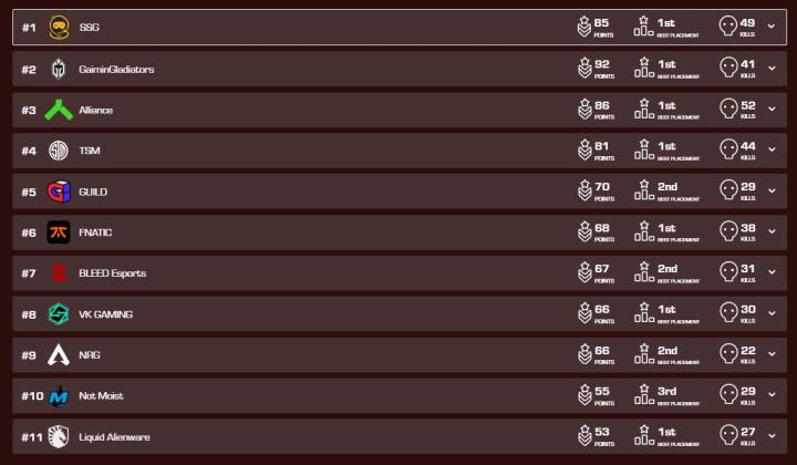 目前11支队伍开启赛点:GG、SSG、Alliance、TSM、VKG、FNC、NRG、GUILD、BLEED、Not Moist、Liquid