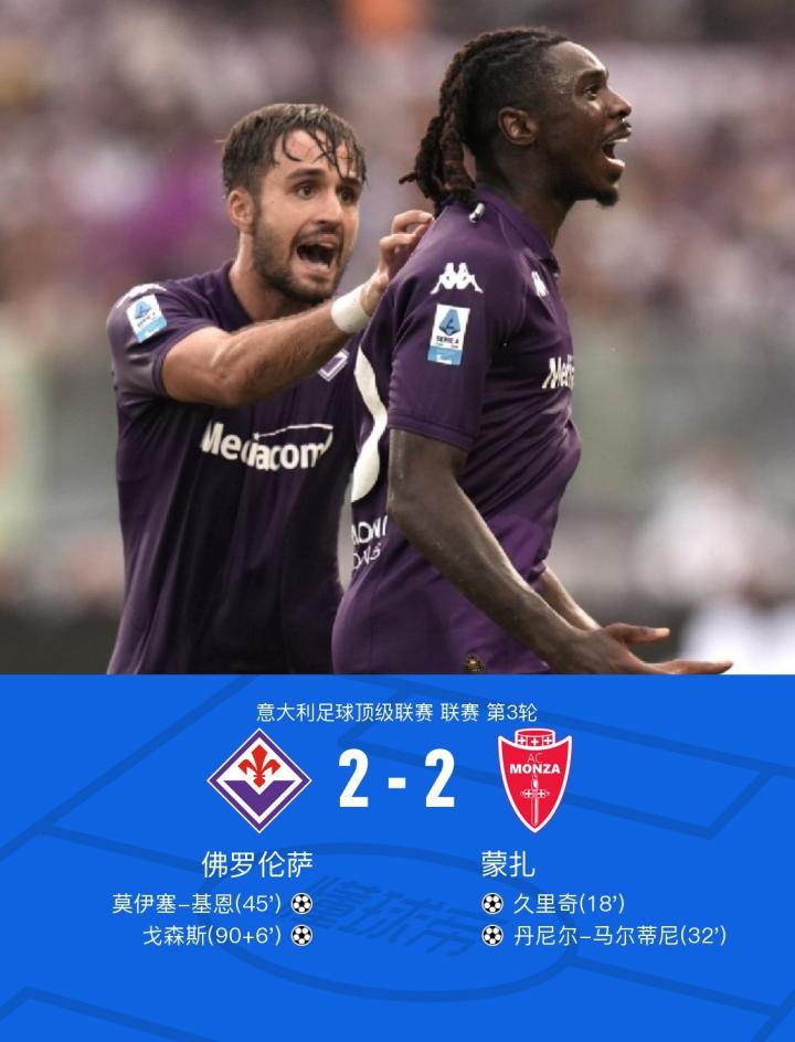 在意大利足球顶级联赛第3轮的比赛中,佛罗伦萨主场迎战蒙扎。比赛中,佩德罗-佩雷拉率先助攻久里奇完成破门,丹尼尔-马尔蒂尼外围调整直接兜射破门将比分扩大,下半场卢卡-拉涅利助攻莫伊塞-基恩门前垫射破门扳回一城,比赛补时阶段,阿德利角球开到禁区,戈森斯抢点头球破门绝平了比分,全场战罢,最终佛罗伦萨2-2蒙扎,双方握手言和各取一分。