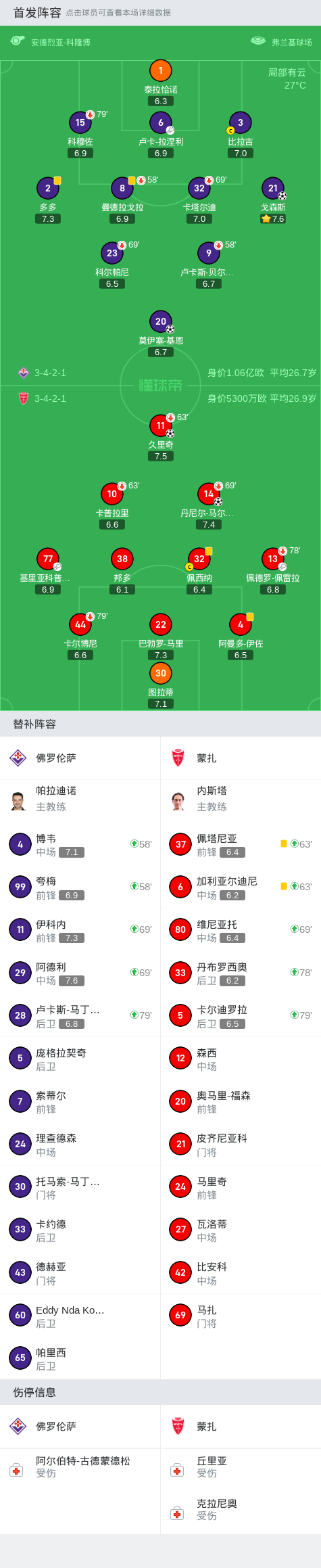 佛罗伦萨2-2蒙扎,久里奇先拔头筹,戈森斯绝平比分