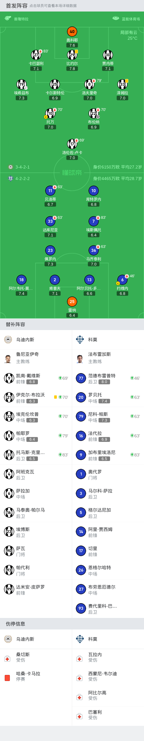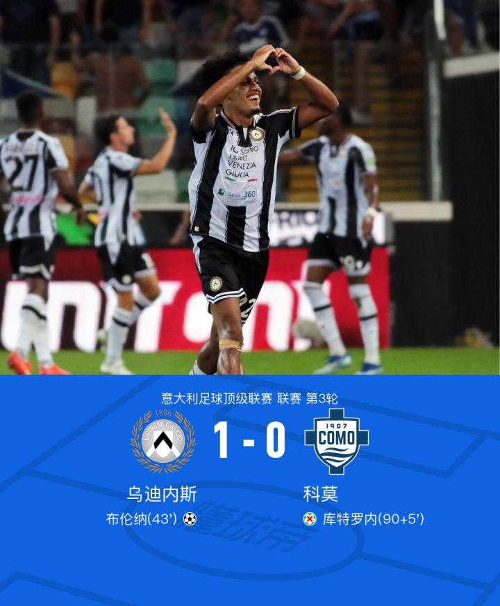 乌迪内斯1-0科莫,布伦纳一击制胜,库特罗内失点