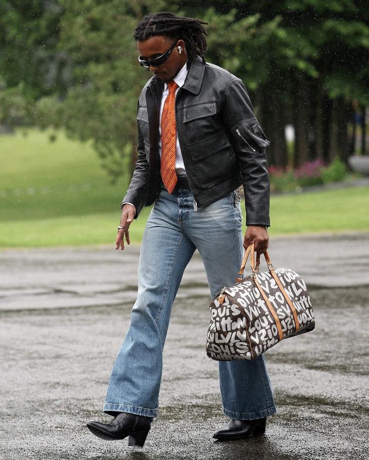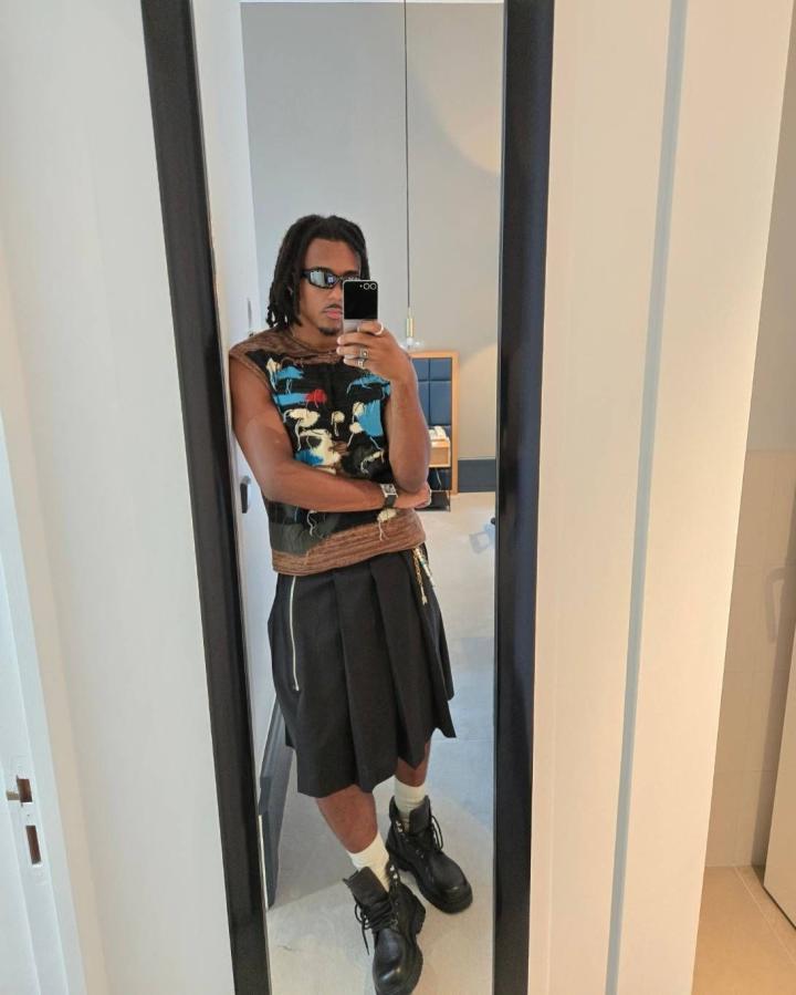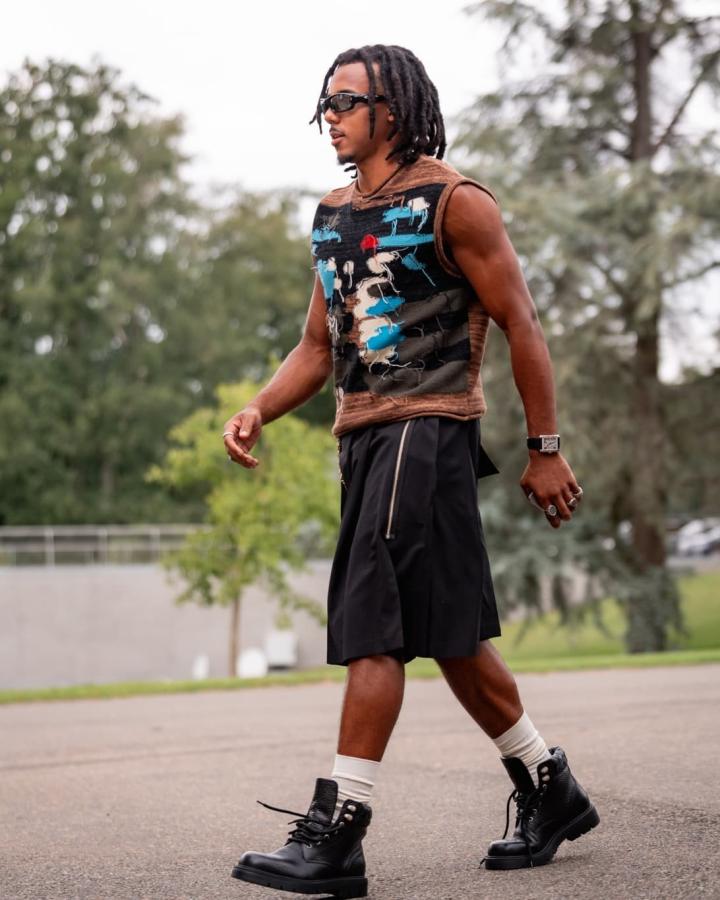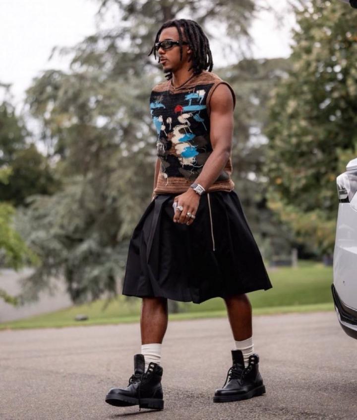 这位巴萨后卫穿了一件无袖背心,上面有抽象的图案,配上黑色的裤裙和高帮靴子,再加上黑色墨镜和脏辫发型,整体造型非常有个性。