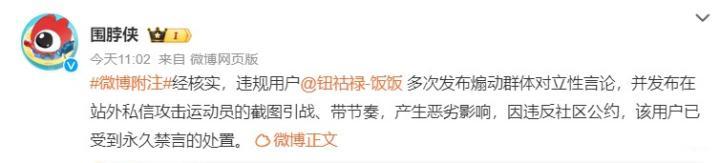 今天上午,这位用户因多次发布煽动群体对立性言论,并发布在站外私信攻击运动员的截图引战、带节奏,受到微博账号永久禁言的处置。