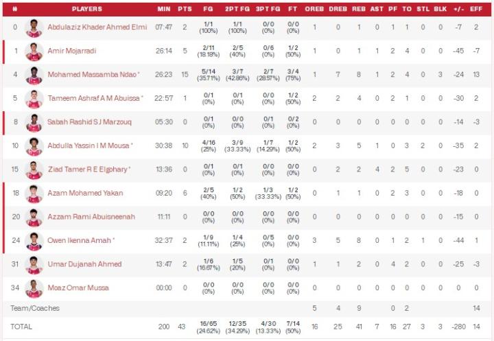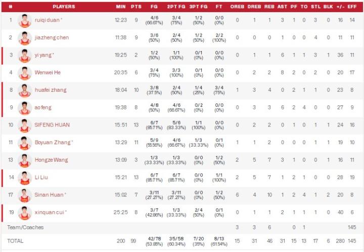 本场中国队12人全部得分,郇斯枫13分2板,刘李13分7板,张博源11分2板,彰华非10分4板,冯傲8分3板6助,郇斯楠7分10板,杨家政9分4断。