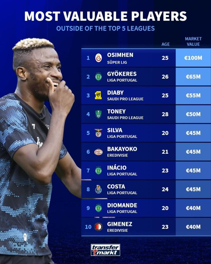 德国转会市场统计了五大联赛外球员的身价排行,其中奥斯梅恩1亿欧第一,哲凯赖什6500万欧第二,迪亚比5500万欧第三。