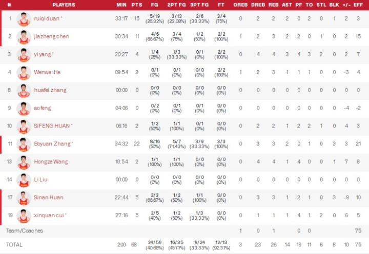张博源22分3板2助3帽,段睿骐15分2板2助,陈家政11分3板2助,郇斯楠5分3板3帽,杨溢4分4板3助2断。