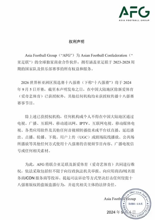 “AFG将联合亚足联及新爱体育(爱奇艺体育)共同进行维权,依法采取包括但不限于向行政执法机关举报、向应用商店/域名服务商/CDN服务商等投诉、提起司法诉讼等方式坚决打击任何侵犯十八强赛版权的盗版盗播行为,并追究相关主体的法律责任。”
