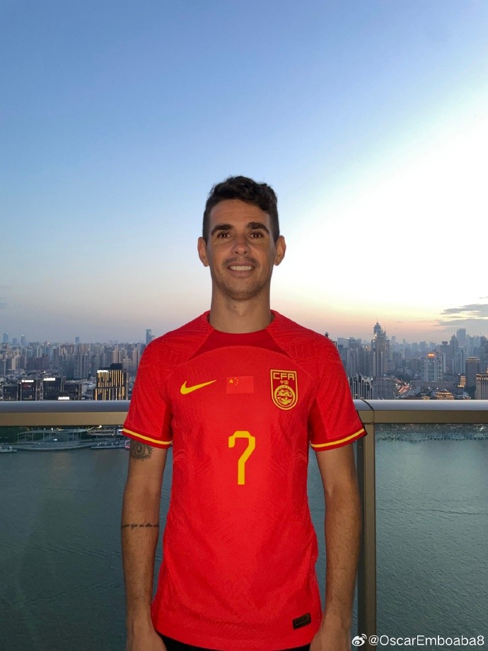上海海港外援奥斯卡在微博里晒出他身穿中国队7号(武磊)球衣的照片,为即将出战世预赛18强赛的国足加油打气。