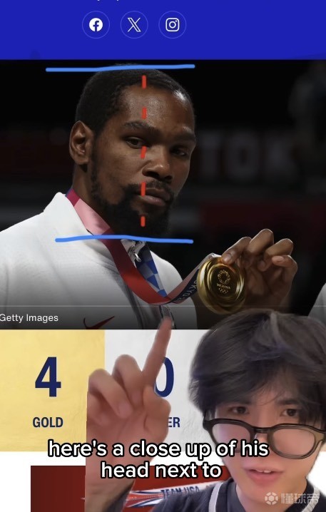 博主小哥先测出杜兰特头部的长度,因为这张图片中他的头和金牌很近,可以排除一些视觉上的误差。已知一颗奥运金牌的直径为85mm,测出杜兰特的头有3.08737个金牌高,得出杜兰特一颗头长26.24cm。