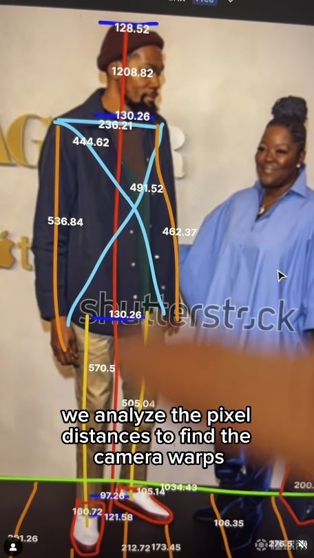 随后,小哥找出另外一张参考照片,是杜兰特和他母亲的合影。杜兰特妈妈手上提着一个包,小哥找到这个包的信息,高7.5英寸。然后在软件中,以像素数量标出杜兰特身体各个部分的长度,测出相机产生的视觉畸变。