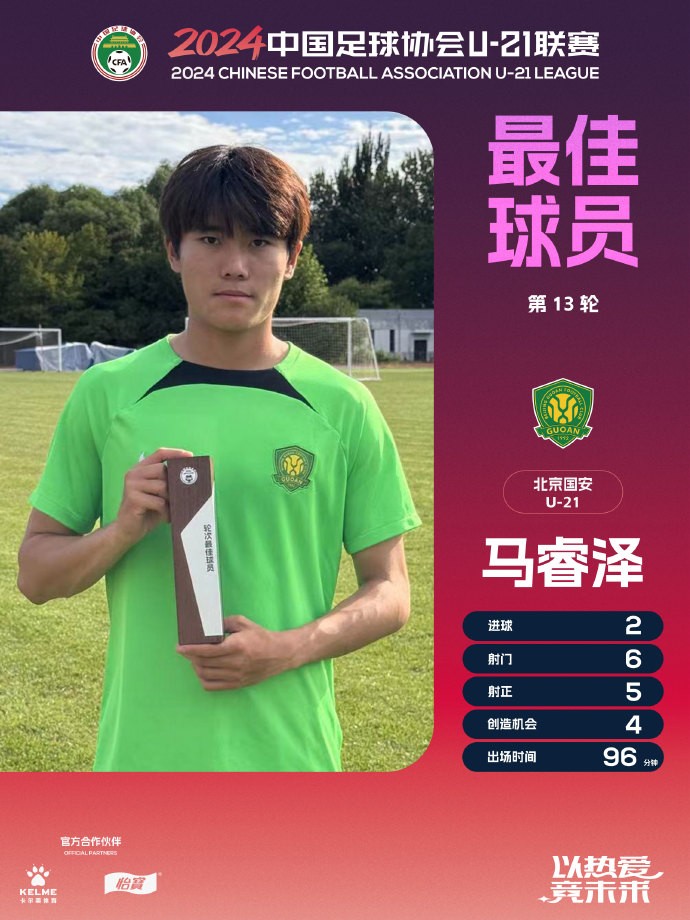 最佳评选|2024中国足球协会U-21联赛决赛第三阶段第13轮 最佳球员:马睿泽(北京国安)