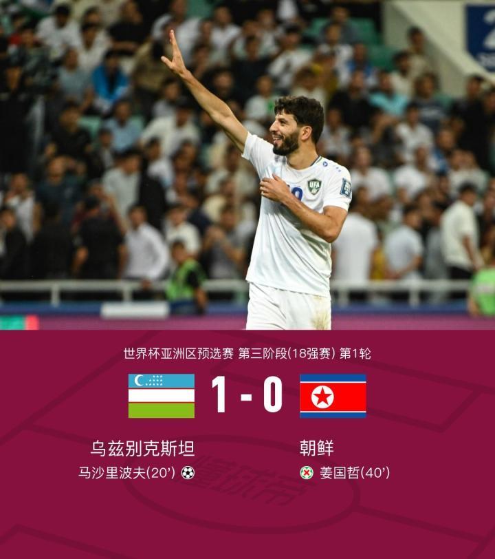 北京时间9月5日22:00,在世界杯亚洲区预选赛第三阶段的首轮比赛中,乌兹别克斯坦迎战朝鲜。上半场,马沙里波夫劲射破门,为球队取得领先。随后,姜国哲造点亲自操刀错失扳平比分的良机。最终,乌兹别克斯坦以1-0战胜朝鲜,收获18强赛开门红。