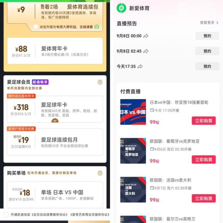 爱奇艺体育全媒体独播了世亚预首轮日本男足与中国男足的比赛,在爱奇艺体育APP上本场比赛的非会员售价为18元,会员售价为8元,爱足球会员直接观看,至于所谓的9元售价,其实是体育会员的价格,开通体育会员是9元/月,每月赠送两场观赛券,可以选择观看2场足球直播。