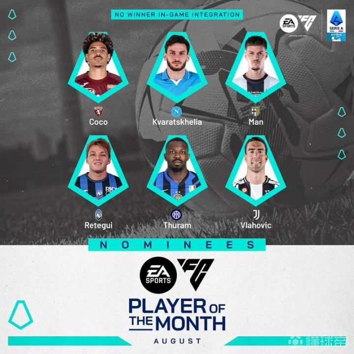 意甲官方公布了联赛8月份最佳球员的6位候选者,其中包括了国际米兰的马库斯-图拉姆、尤文图斯的弗拉霍维奇、那不勒斯的克瓦拉茨赫利亚以及亚特兰大的雷特吉。