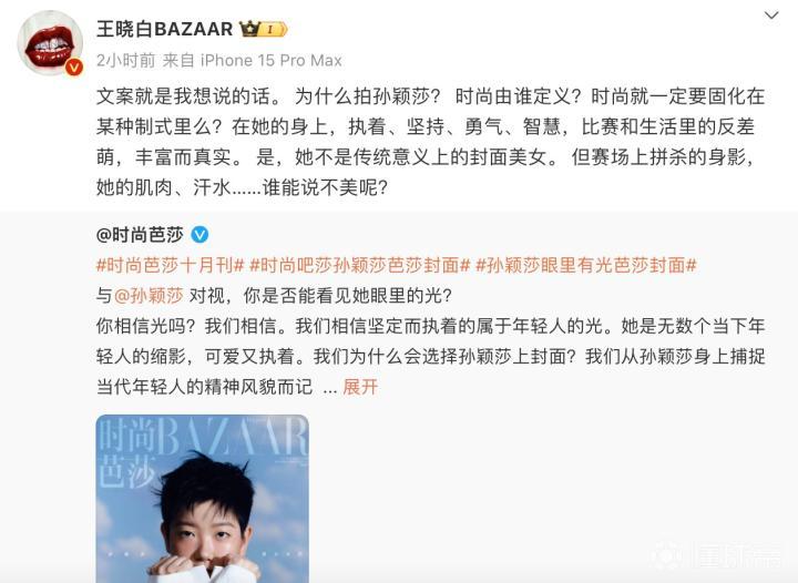 《时尚芭莎》总监在社交平台上发文赞美孙颖莎: 为什么拍孙颖莎? 时尚由谁定义?时尚就一定要固化在某种制式里么?在她的身上,执着、坚持、勇气、智慧,比赛和生活里的反差萌,丰富而真实。 是,她不是传统意义上的封面美女。 但赛场上拼杀的身影,她的肌肉、汗水……谁能说不美呢?