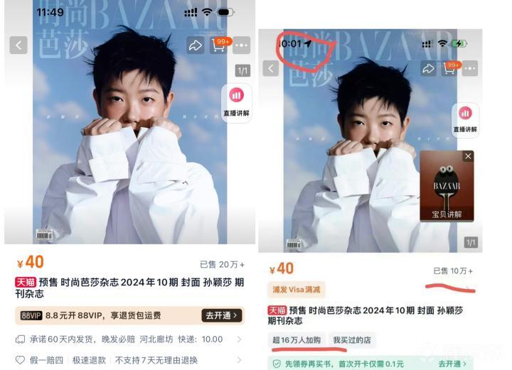 今日上午十点,奥运冠军孙颖莎为《时尚芭莎》拍摄封面的杂志开启预售,售价为40元。预售一分钟就突破了10万的销量,现在销量已达到20万+。