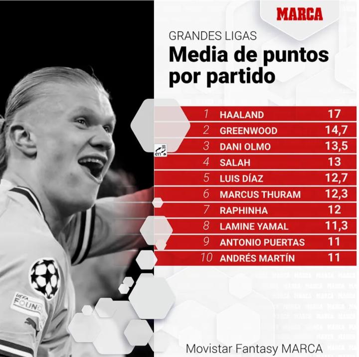 在Movistar Fantasy MARCA这款游戏中,系统会结合现实表现为球员们进行评分,据《马卡报》报道,哈兰德、格林伍德领衔评分最高的十名球员。