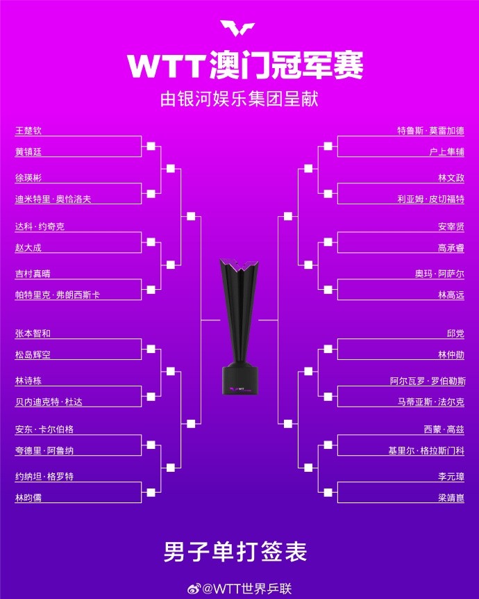WTT澳门冠军赛男单签表:王楚钦首轮对阵黄镇廷