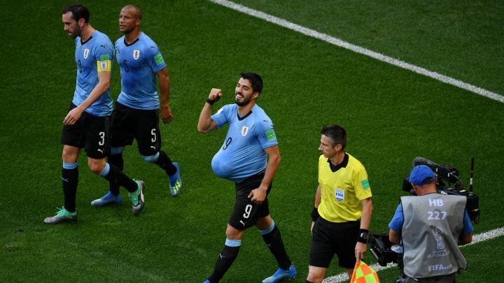6月25日,第三场小组赛,乌拉圭3-0战胜东道主俄罗斯,苏亚雷斯在比赛第10分钟用一记精彩的任意球为乌拉圭首开纪录,再次当选全场最佳球员。