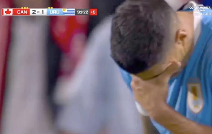 比赛的最后几分钟,苏亚雷斯泪流满面,乌拉圭1-2落后于加拿大,他可能又要输了。