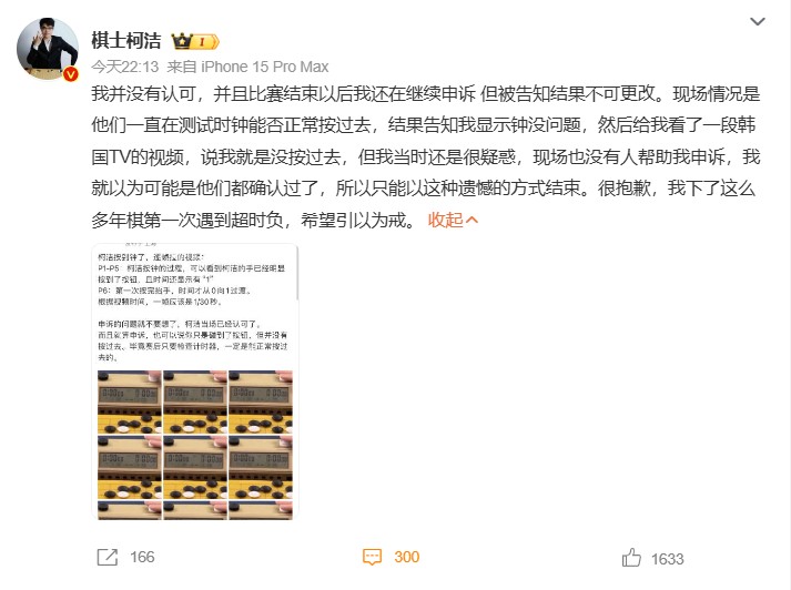 赛后,关于柯洁最后究竟是否有无超时引发了讨论,柯洁自己也更新了社媒驳斥了网上关于自己认可了判罚的言论。