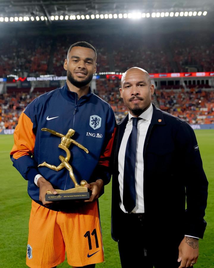 欧国联A级联赛,荷兰对阵波黑,荷兰队迎来欧洲杯后的首场主场比赛,赛前,加克波领取了2024年欧洲杯最佳射手奖杯,为他颁发奖杯的是前荷兰国脚、现荷兰足协足球总监奈吉尔-德容。