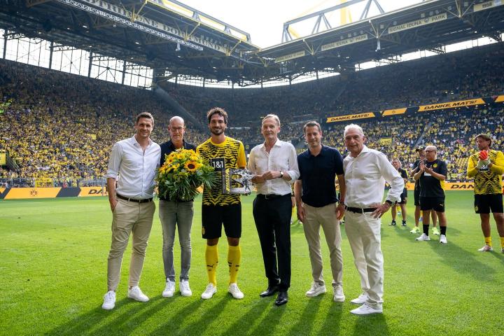 在这场告别赛开打前,多特蒙德为胡梅尔斯举行告别仪式,向这名35岁老将献上鲜花和纪念奖杯。当胡梅尔斯踏入球场,掌声雷动,呐喊声不断,这名中卫绕场向多特球迷表示感谢。