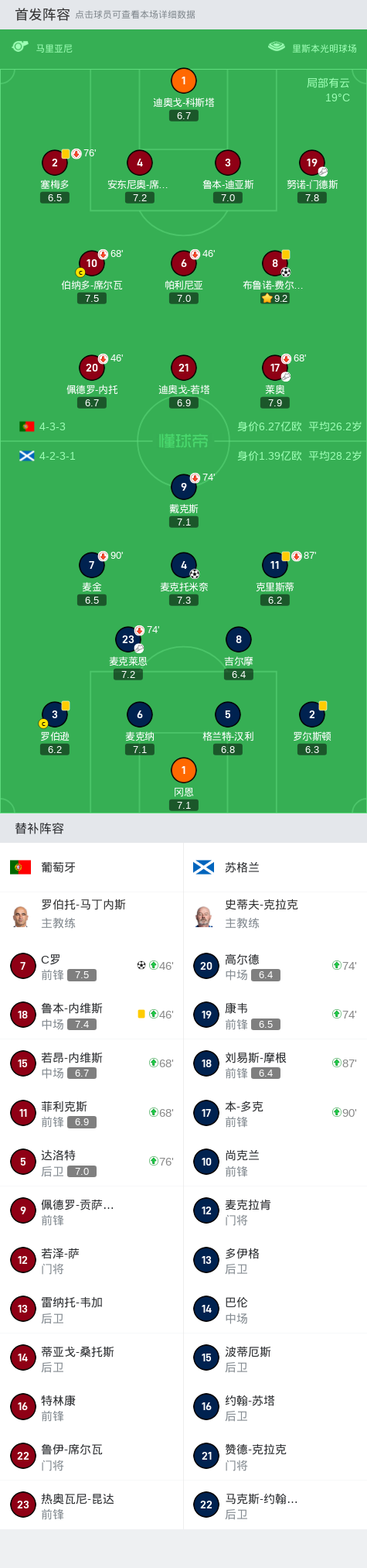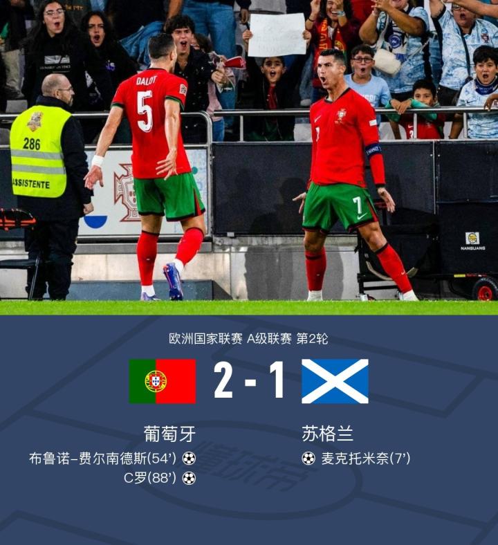 葡萄牙2-1逆转苏格兰,C罗绝杀,B费生日夜远射建功