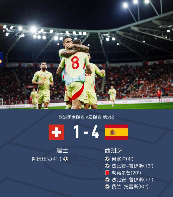 【十人西班牙4-1瑞士,鲁伊斯双响,费兰传射,亚马尔献助攻】