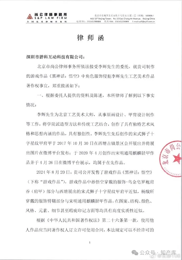 律师函提到,2024年8月20日,《黑神话:悟空》游戏作品中孙悟空穿戴的服饰-乌金皂罗袍肩吞(肩甲)部分与西塘展出的宋式狮子十字星纹甲肩甲近似,杨戬穿戴的服饰臂鞲部分与宋明通用麒麟胫甲作品,在图案、结构、颜色、风格、元素、细节甚至瑕疵印记方面等均具有高度实质性近似。