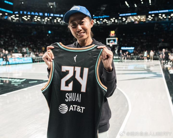 美网女双亚军光临,张帅观战WNBA纽约自由人比赛并获赠球衣