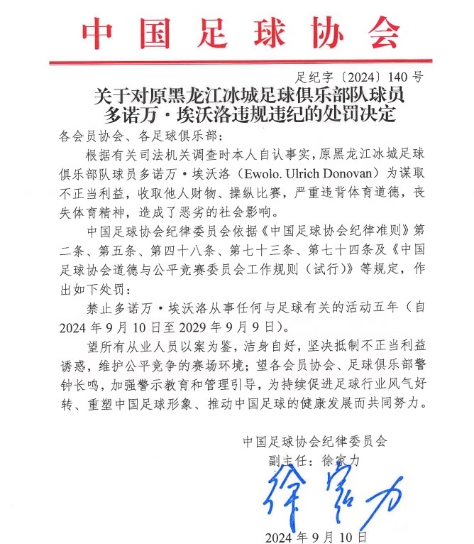 北京时间9月10日,国家体育总局、公安部联合召开足球职业联赛“假赌黑”问题专项整治行动新闻发布会。随后,中国足协官方公布禁足具体名单。值得一提的是,现效力于科威特联赛球队的前中超外援埃沃洛也被处以禁赛五年处罚。
