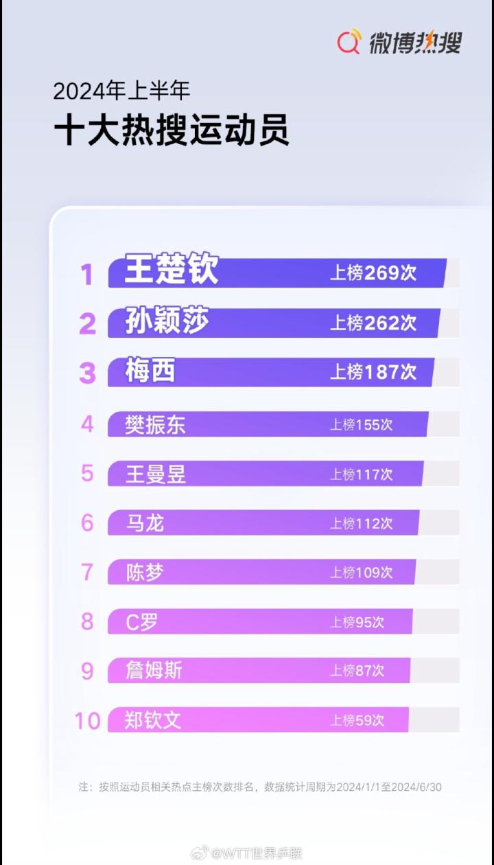 2024年上半年十大热搜运动员:国乒前7占6席,梅西第3&C罗第8凡尔赛小木屋 @懂球帝2024-09-11 12:239月10日,2024年上半年微博热搜趋势报告发布,上半年十大热搜运动员出炉。具体排名如下1、王楚钦 上榜269次2、孙颖莎 上榜262次3、梅西 上榜187次4、樊振东 上榜155次5、王曼昱 上榜117次6、马龙 上榜112次7、陈梦 上榜109次8、C罗 上榜95次9、詹姆斯 上榜87次10、郑钦文 上榜59次展开更多