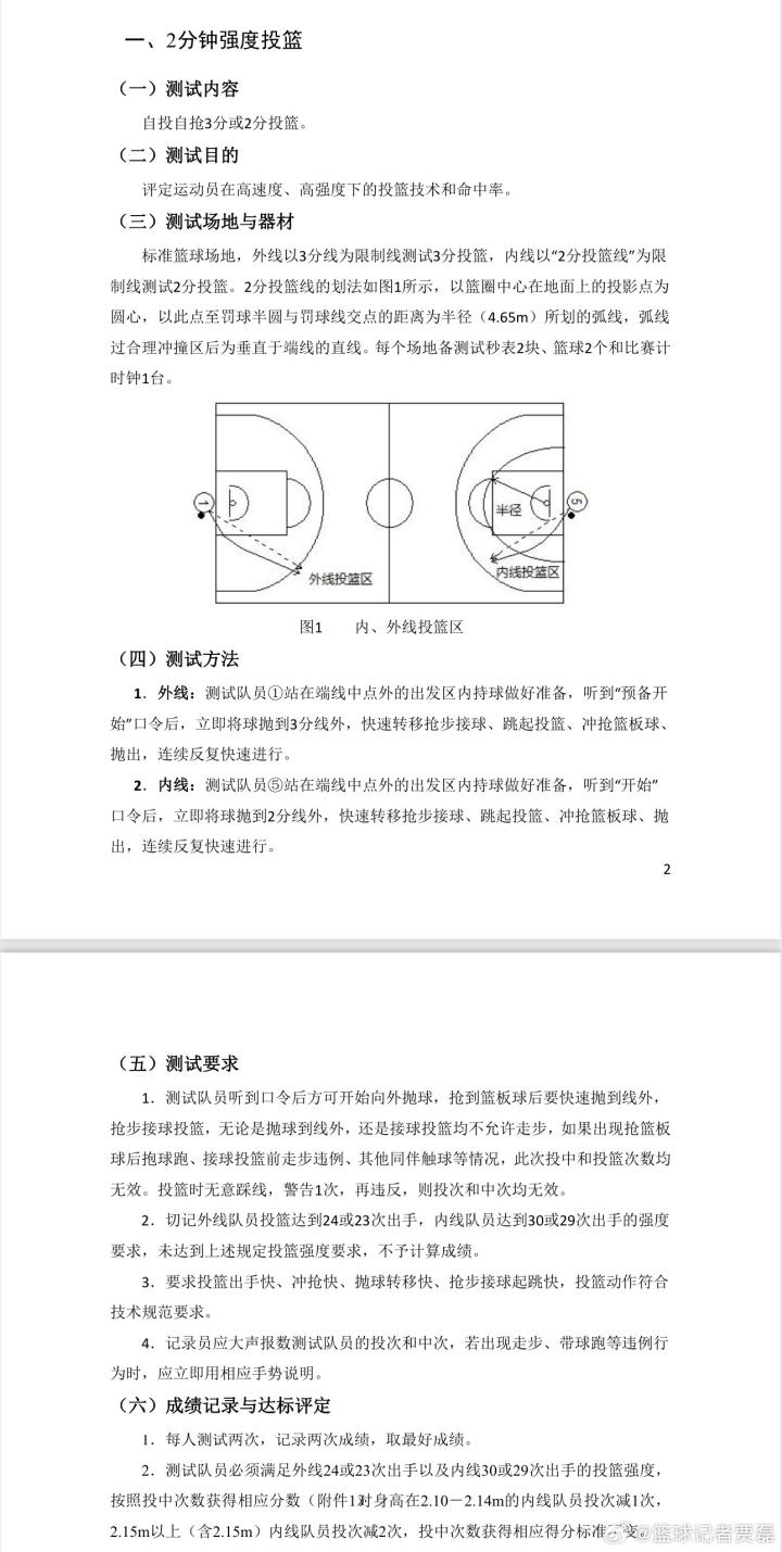 强度投篮测试要求外线队员在测试中投篮达到24或23次出手,每人测试两次,取最好成绩。”