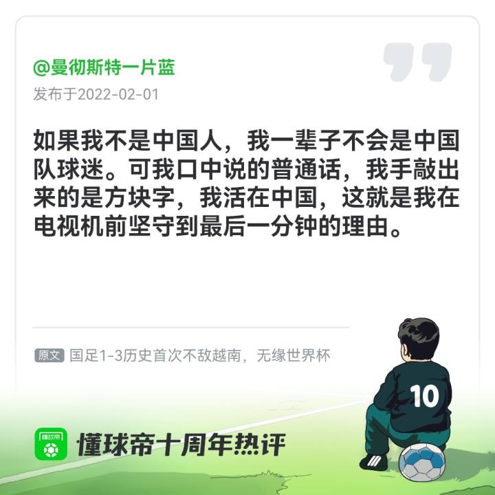 但尽管如此,我们对国足的坚守也没有受到影响。踢得差,我们会批评,也会和不懂球、不讲理的无脑喷据理力争;在国足战绩每况愈下、甚至只有两位记者随队前往日本的情况下,其中一位来自懂球帝;