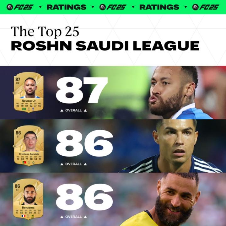 FC25沙特联能力值TOP25:内马尔第1,C罗、本泽马、坎塞洛第2