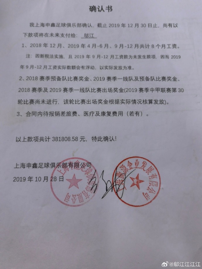 前上海申鑫球员邬江在社媒晒出了俱乐部给他的欠条并写道:“只能说同为底层球员理解吧。借这个机会晒一晒自己的欠薪吧,足协没有管控的能力,俱乐部一欠薪就解散球队,导致球员求告无门。法院起诉,法院不受理,要求去到中国足协仲裁,有什么用?腿都为球队拼断了,工伤也认定了,医疗费康复费三十万,都是自己垫付,就给了一张无限期的欠条,老板母公司在,俱乐部公司也在,可就是没办法要到自己的血汗钱 。”